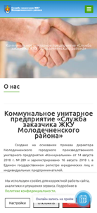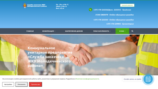 | AI-анализ | Портал "Служба заказчика ЖКУ Молодечненского района - Главная" является официальным сайтом для Службы заказчика жилищно-коммунальных услуг в Молодечненском районе. Он предлагает информацию о службе и её функциях, включая обработку обращений граждан и юридических лиц, электронные обращения, а также различные инициативы, такие как День безопасности и антикоррупционные действия. Сайт содержит раздел с контактами, включающий телефонные номера и адреса электронной почты для разных отделов, а также раздел "Часто задаваемые вопросы". На сайте используются куки для обеспечения функциональности сайта и его анализа. Основное меню включает разделы с информацией, услугами и контактами. Сайт доступен для обращений по понедельникам до пятниц, с 8:00 до 17:00, за исключением субботы и воскресенья. Посетители могут связаться с приемной службой по телефону +375 (176) 525-33-32 или через электронную почту. |