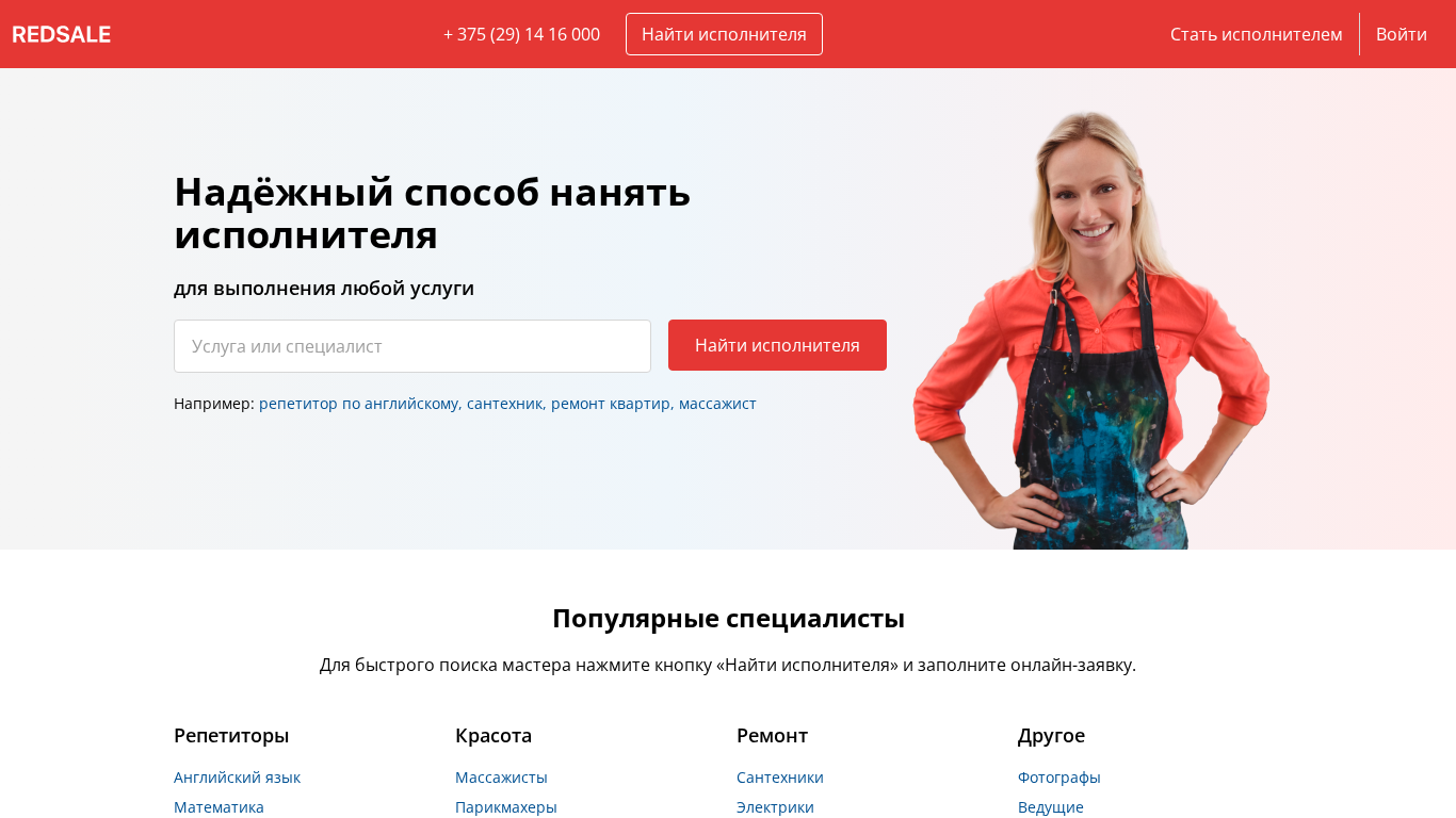 | SEO-описание | Редcейл – сервис по поиску проверенных мастеров в Витебске: мастеров по ремонту, репетиторов, артистов, спортивных тренеров и других профессионалов. На сайте собраны анкеты с указанием цен и отзывами от клиентов. |