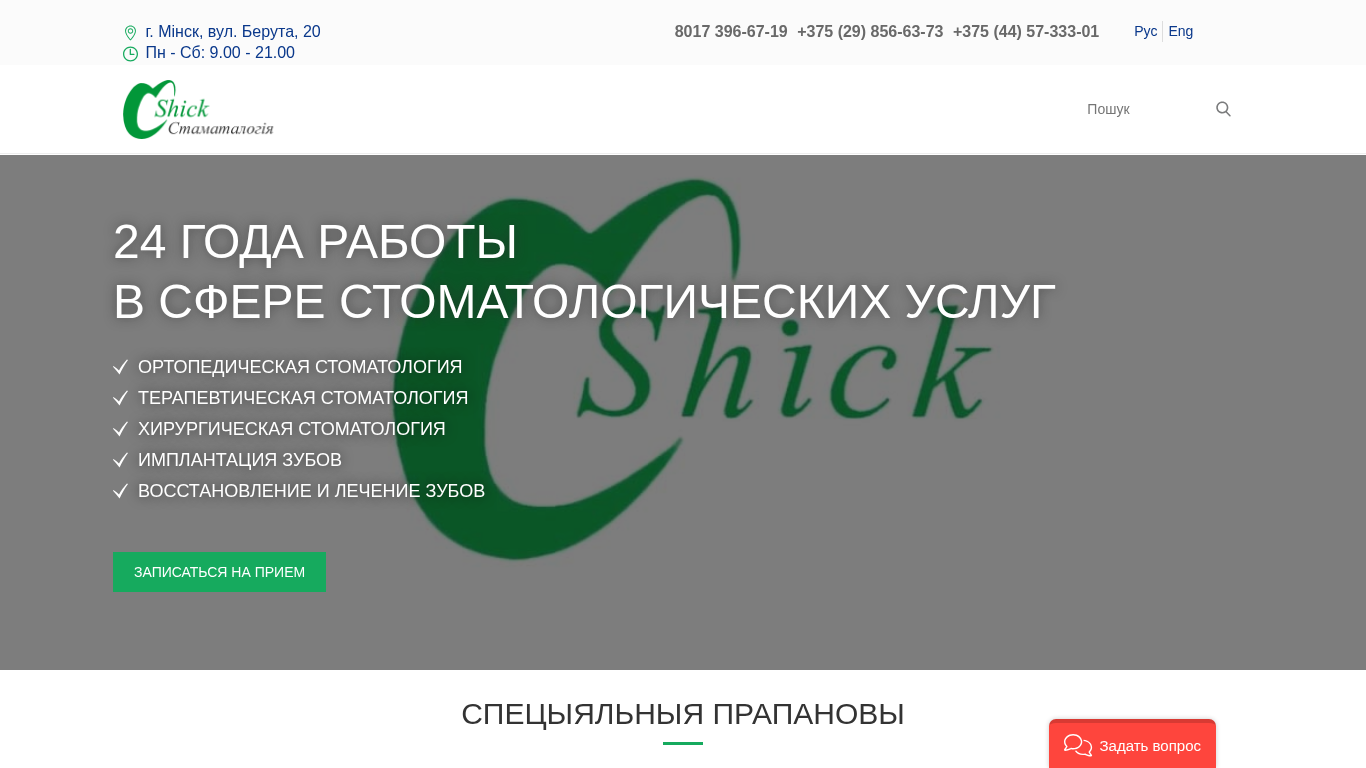 | Адрес | стаматалогія "Шык-Дэнталь", Меню:, Пацыенты, О клинике, Паслугі, Акции, Цены, Кантакты, Кантакт:, г. Мінск, вул. Берута, 20 |