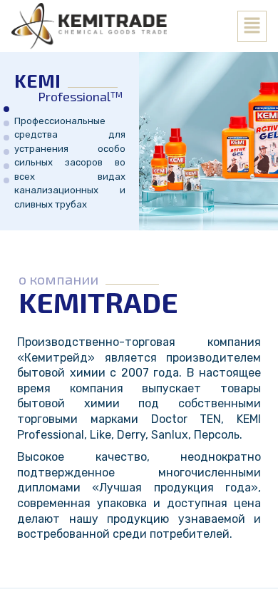 | SEO-описание | Компания «Кемитрейд» - производитель бытовой химии под собственными торговыми марками Doctor TEN, KEMI Professional, Like, Derry, Sanlux, Персоль |