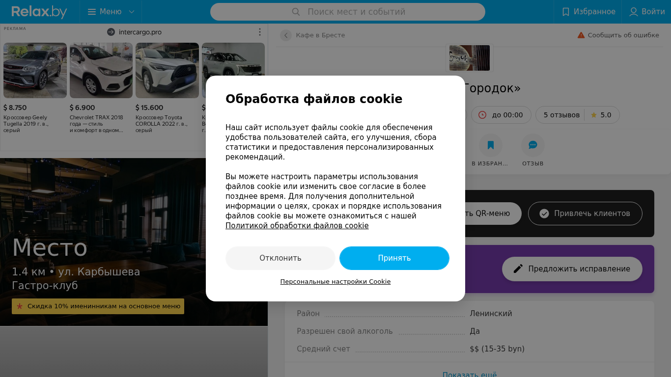 | SEO-описание | Кафе Городок в Бресте – ⚡меню с ценами и фото, ⚡отзывы посетителей, адрес на карте, ✍бронирование столика онлайн на Relax.by. |