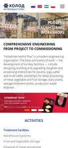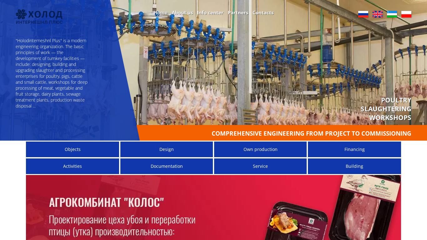Сайт предназначен для современной инженерной организации под названием "Холодинтернешнл Плюс", специализирующейся на проектировании, строительстве и модернизации предприятий по убою и переработке птицы, свинины, крупного рогатого скота и мелкого рогатого скота, а также на создании цехов глубокой переработки мяса, складов для хранения овощей и фруктов, молочных заводов и очистных сооружений. Компания предлагает комплексные инженерные услуги от проекта до пуска, включая оборудование для обработки пищевых продуктов, системы склада и системы утилизации отходов мясной промышленности. Сайт содержит разделы "Деятельность", "Проект", "Собственное производство", "Документация", "Контакты" и "Оборудование завода по очистке", с подрубриками "Цеха для убоя птицы", "Компрессорное оборудование" и "Холодильное оборудование". Компания также предоставляет оборудование для обработки мяса, оборудование завода по очистке и предлагает полные решения для цехов по убою и переработке мяса. Услуги включают в себя выбор проекта, установку и пуск оборудования, ввод в эксплуатацию, обучение и т.д.