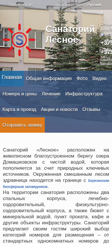 | AI-анализ | Этот сайт представляет собой санаторий под названием "Лесное", расположенный на живописной и ухоженной береговой линии озера Домашковского в Беларуси, где вода добывается из естественных источников. Окруженный смешанным лесом, санаторий находится на границе Берецинского биосферного заповедника. В его состав входят два спальных корпуса, блок терапевтический и рекреационный, а также пункт питания, точка проката оборудования, кафе и другие инфраструктурные объекты. Санаторий предлагает широкий спектр категорий проживания для гостей, от стандартных однокомнатных номеров до апартаментов. В санатории расположены просторные и светлые комнаты, оборудованные телевизором, чайником, холодильником и утюжной установкой. Санаторий имеет обширную терапевтическую базу и предлагает комплексное лечение для гостей с проблемами сердечно-сосудистой системы, скелетно-мышечной системы и других заболеваний. |