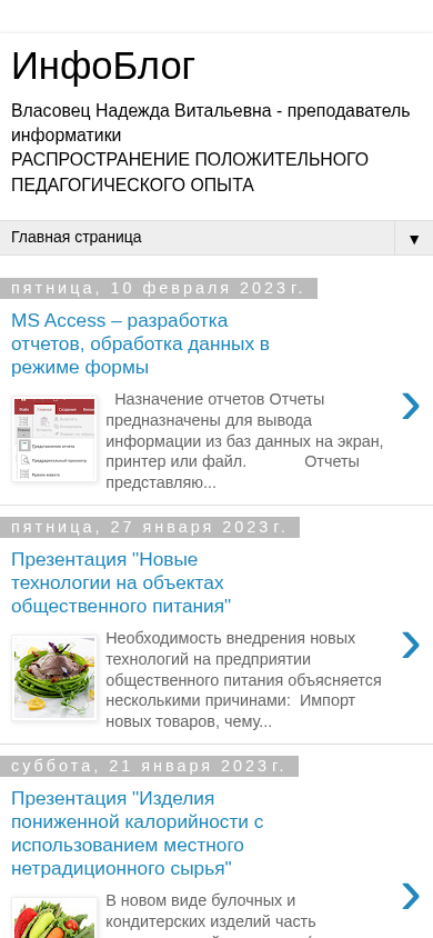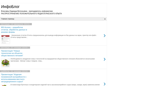 | AI-анализ | Этот сайт представляет собой информативный блог Надзеи Власовец, учителя информатики, где она делится положительными образовательными опытом. На сайте представлены разделы: главная страница, биография автора, фотографии, полезные ссылки и карта блога. Обсуждаются темы, такие как разработка отчетов с использованием MS Access для обработки данных, презентации о новых технологиях в общественном питании, производство здоровой пищи с применением местных нестандартных ингредиентов. Также на блоге представлены практические работы по запросам данных и расчету результатов с использованием MS Access. Посты на блоге датированы от февраля до января 2023 года. |