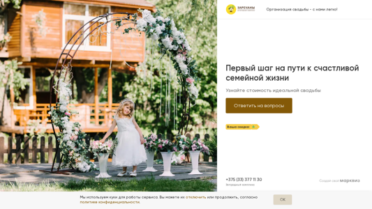 | AI-анализ | Этот сайт носит название "Свадьба в усадьбе всё включено!" и предлагает информацию о организации свадьбы в усадебном доме. Описание подчеркивает, что это легко сделать с их помощью, и что первый шаг к счастливой семейной жизни можно начать здесь. Посетители могут узнать стоимость и детали идеальной свадьбы, а также ответить на любые возникшие вопросы. Предоставляется номер для связи "+375 (33) 377 11 30". Используются куки для предоставления услуги. |