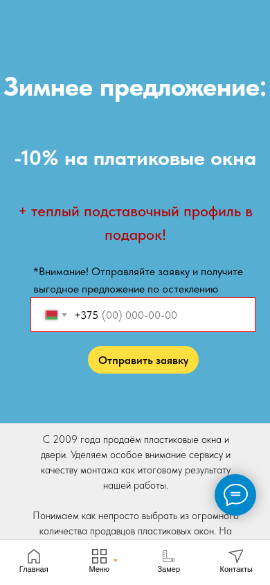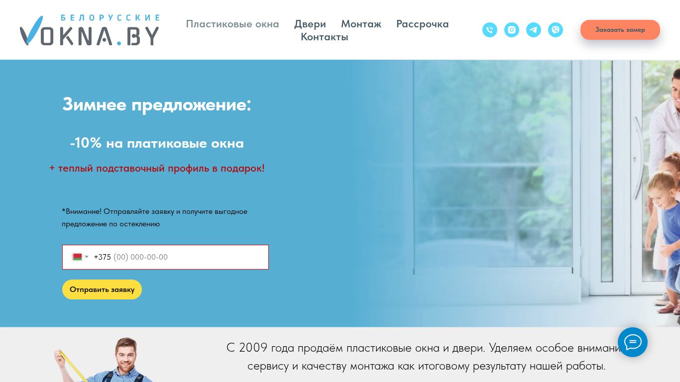 Сайт предназначен для компании, торгующей пластиковыми и алюминиевыми окнами и дверями с гарантией на установку в течение 25 лет. На сайте представлен обширный каталог цен на пластиковые окна, пластиковые двери и услуги по установке. Компания предлагает финансирование и предоставляет контакты для оформления заказа и запроса на замер. Сайт также включает в себя калькулятор для расчета стоимости окон и раздел с условиями оплаты. В работе компании акцент делается на важности хорошего сервиса и качественной установки, а потенциальным клиентам рекомендуется учитывать разницу в ценах и правильные методы монтажа. Ссылка на Instagram демонстрирует завершенные проекты и отзывы покупателей. Доменное имя сайта — vokna.by.