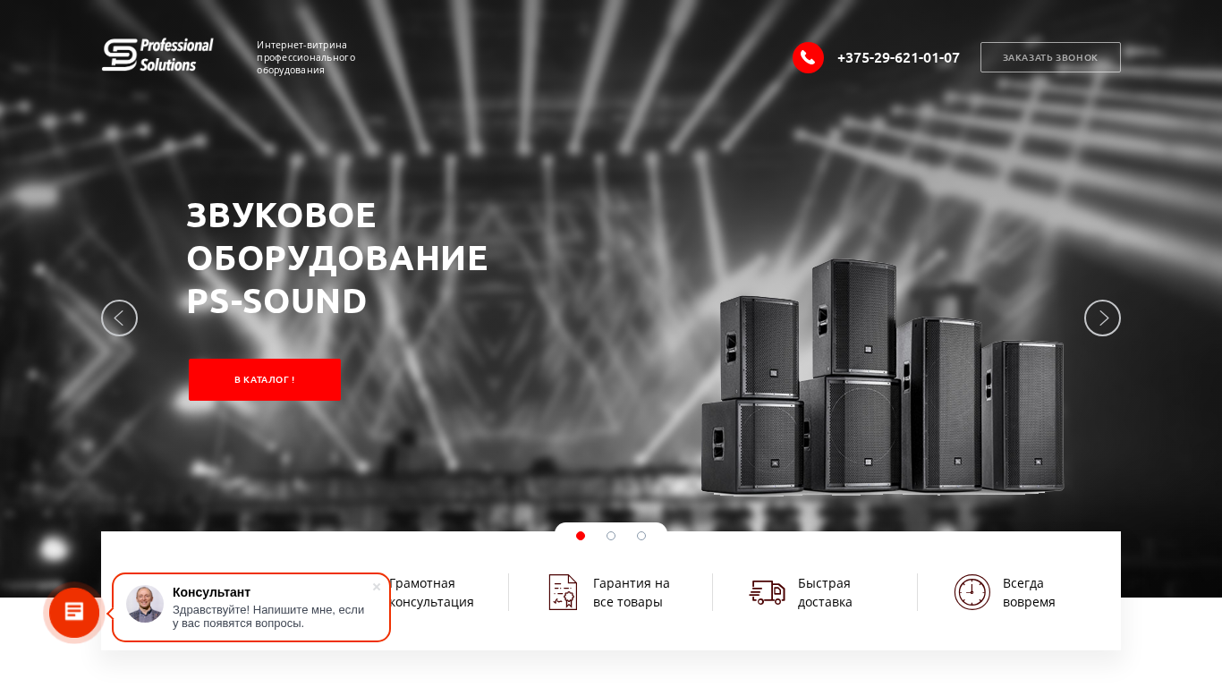 Этот сайт является платформой для электронной коммерции, предлагающей профессиональные решения в области освещения и звука. Название сайта "Профессиональные решения", а описание включает ключевые слова, связанные с системами освещения и звука, такие как "PS-Light", "PS-Sound", "PS-LED" и различные типы и модели оборудования. Сайт предлагает каталог для клиентов, где они могут просматривать и приобретать товары, включая колонки, микрофоны и аксессуары. Также сайт подчеркивает доступность и быстрое доставление товаров, а также качество и доступность самих товаров. Контактная информация на сайте включает номер телефона и просьбу клиентов обращаться к консультанту за любыми вопросами. Сайт предлагает разнообразные решения в области освещения и звука, с брендами, такими как PS-Sound, PS-Light и PS-LED. Доступны также аксессуары для установки и транспортировки. Сайт расположен по адресу pspro.by.