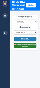 | AI-анализ | This online resource, titled "Колледж - Расписание" (College - Schedule), is dedicated to providing a schedule for a college, likely a specific branch or campus of the Belarusian State Technical University of Oil and Gas (БТЭУПК). Users can access the site and select their desired group to view the corresponding schedule. The site includes schedules for various groups labeled with numbers such as 1-ДПТО, 11-ИБ, 11-ЛБ, 11-МБ, 11-ПБ, 11-ТБ, 11-УБ, 11-ЭБ, 12-ПБ, 21-ИБ, 21-Л, 21-ЛБ, 21-М, 21-МБ, 21-П, |