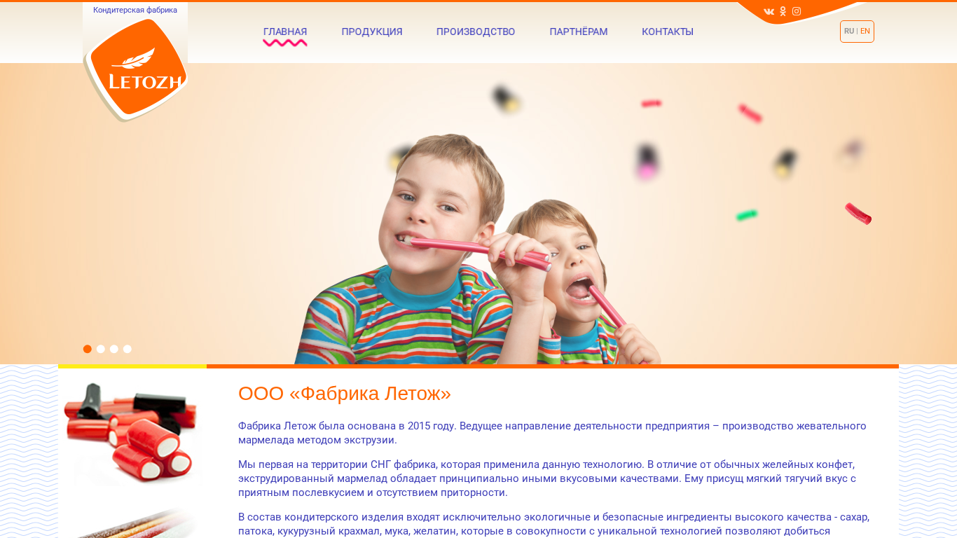 | SEO-описание | ООО «Фабрика Летож» была основана в 2015 году и ориентирована на производство экструдированного жевательного мармелада. |