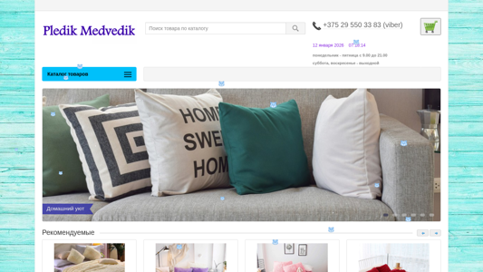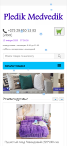 | AI-анализ | The portal provides a selection of plush pads for sale in Minsk and Belarus. The offer includes various styles and colors such as a vanilla, lavender, rose-colored coral, and violet one. Customers can purchase plush pads measuring 220x240 cm for 50 BYN each and smaller 50x50 cm ones for 20 BYN. The website offers a range of other home textiles to complete the cozy atmosphere. The homepage includes a shopping cart that shows empty, and the catalog presents various categories like 'пушистые пледы' (plush pads), 'пушистые подушки' (plush pillows), and 'домашний уют' (home comfort). The website also provides contact information including a phone number for Viber and operating hours from Monday to Friday 9 AM |