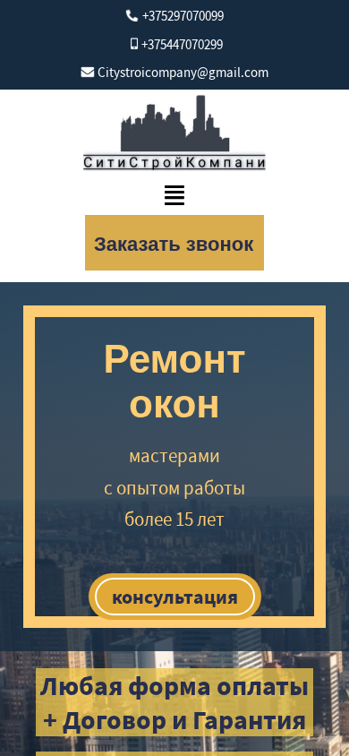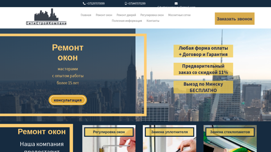 | AI-анализ | The web project "CitystroiCompany.by" is a producer of windows in Minsk and the surrounding area offering repair services at low prices. The company provides a warranty of up to 60 months on labor and components. Free call-out of a surveyor, delivery, and service are included. Keywords associated with the site include building materials and services. The site includes sections for window repair, door repair, window regulation, mosquito nets, useful information, and contacts. The company offers a consultation, accepts various forms of payment, and provides a contract and guarantee. Preliminary orders come with a 11% discount. The company provides service in Minsk and the Minsk region. The team consists of experienced masters in PVC repair, as well as specialists in regulation and other aspects of PVC window care. Services offered include window regulation, replacement of seals, replacement of glass packs |