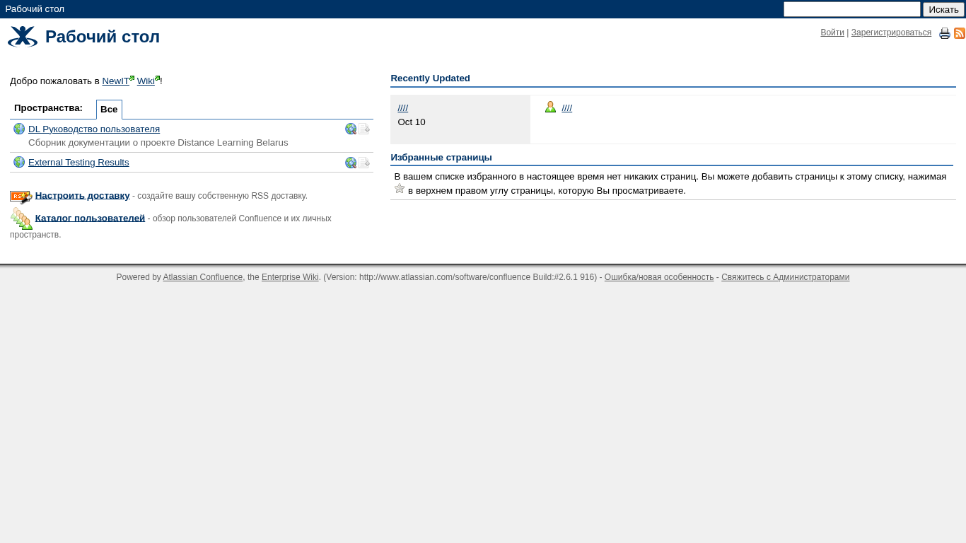 | AI-анализ | This website is titled "Рабочий стол - NewIT Confluence" and is powered by Atlassian Confluence, the Enterprise Wiki. It provides access to various spaces including "Все", "DL", "Руководство пользователя", and "Сборник документации о проекте Distance Learning Belarus". Users can log in or register to access their personal spaces and configure RSS delivery. The site features a catalog of users and their personal spaces, as well as a list of recently updated pages. Currently, there are no favorite pages in the user's list. Atlasian Confluence version 2.6.1 is being used. An error or new feature is indicated for administrators to address. |