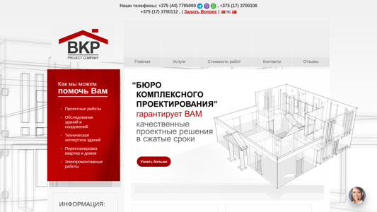 Сайт принадлежит компании "Бюро Комплексного Проектирования" (BKProject), быстро растущей проектной организации, базирующейся в Минске, Беларусь. Основанная в 2009 году, компания стабильно увеличивает объемы своих проектов. Она реализует различные виды работ по проектированию и имеет сертификат на соответствие стандарту ISO 9001 системы управления качеством. BKProject является членом Союза предпринимателей Минска и Союза строителей Беларуси. С 2016 года профессиональная ответственность компании застрахована "Белгосстрахом". С командой опытных и молодых специалистов, BKProject сочетает в себе экспертизу и инновации, предлагая короткие сроки выполнения проектов и использует технологию Autodesk Revit BIM. Компания зарегистрирована как ООО "Бюро комплексного проектирования" (191882733).