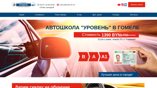 | SEO-описание | Уроки вождения на автомобиле категории «B» в Гомеле с автошколой «Уровень». Стоимость обучения на категорию «А» от 499 руб. действуют скидки на обучение для студентов и мам в декрете. Записаться на курсы вождения мотоцикла вы можете по телефону +375 (29) 537-97-27 |