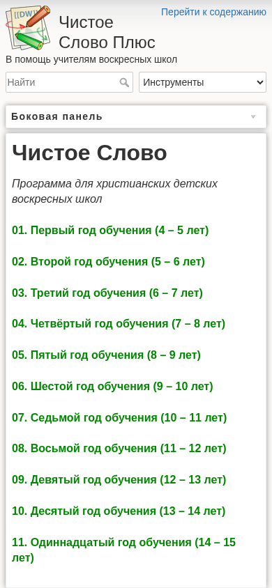 Этот сайт, названный "Чистое Слово [Чистое Слово Плюс]" (Pure Word [Pure Word Plus]), посвящен предоставлению образовательных ресурсов для христианских воскресных школ. Описание раздела пусто, но данные по top_words предполагают, что сайт охватывает различные аспекты образования, включая количество лет обучения (образования), "лет" и слово 'чистое'. Сайт кажется, что предлагает инструменты (инструменты) как для пользователей, так и для самого сайта, и включает разделы для просмотра исходного текста, управления файлами медиа и навигации по всем страницам. На сайте также присутствует обзор проекта, который включает описание программы для христианских воскресных школ детей, с разбивкой курса на каждый год от первого (возраст 4-5) до одиннадцатого (возраст 14-15).