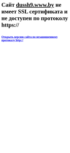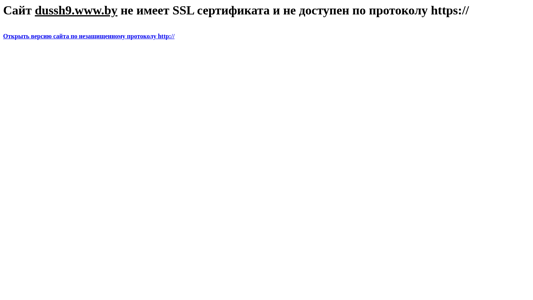 | AI-анализ | Этот сайт dussh9.www.by не имеет сертификата SSL и не доступен по защищенному протоколу HTTPS. Он может быть открыт только с использованием неподписанного протокола HTTP. |
