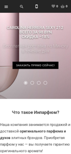Этот онлайн-ресурс под названием "Инпарфюм — продажа и доставка парфюма и духов элитных брендов в Минске" (Inparfum - sale and delivery of perfume and elite perfume brands in Minsk) является веб-сайтом по продаже парфюмерии в Беларуси. Сайт предлагает широкий ассортимент оригинальных парфюмов от престижных брендов для женщин, таких как Джорджо Армани, Кристиан Диор, Ив Сен-Лоран, Версаче, Труассарди, Нина Риччи, Ланкоме, Калвин Клейн, Шанель, Босс, Роберто Кавалли и Каролина Херрера. Для мужчин представлены бренды Джорджо Армани и Босс. Сайт предлагает бесплатную доставку в Минск в течение того же дня для заказов, оплаченных кредитной картой через сайт. Основные ключевые слова, ассоциируемые с сайтом,