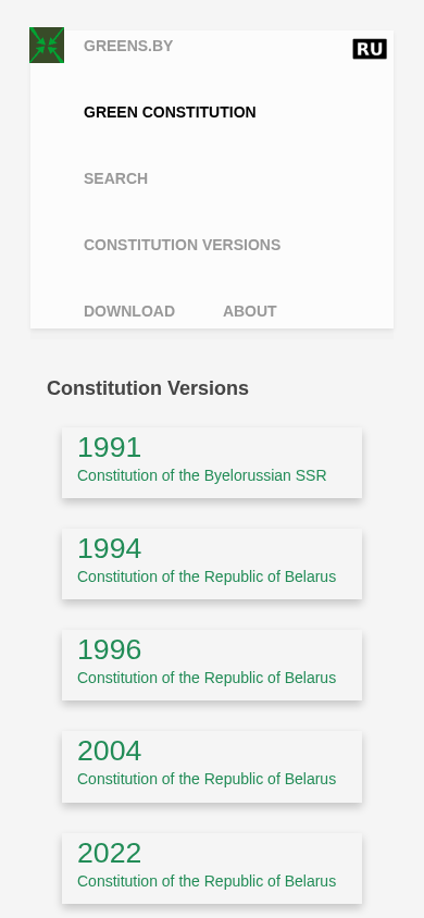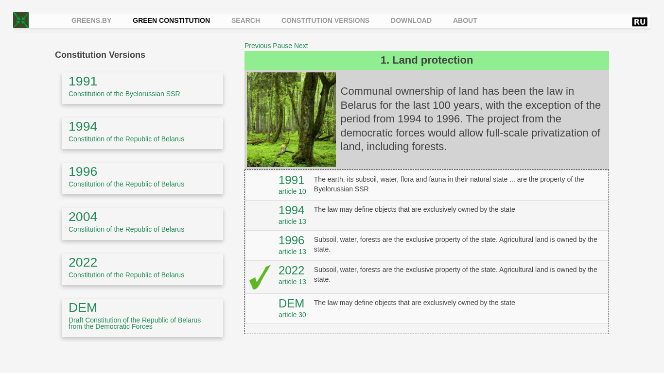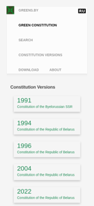 Проект веб-сайта "Зеленая конституция" (greens.by) представляет собой информационный ресурс, посвященный истории и предлагаемым изменениям в области земельного владения и прав на жилище в Беларуси. Сайт предоставляет доступ к различным версиям Конституции Беларуси от 1991 до 2022 года, включая проект конституции от Демократических сил. На сайте объясняется исторический контекст коллективного землевладения и предлагаемые изменения, позволяющие осуществить масштабную приватизацию. Также акцент делается на конституционных гарантиях права на жилище и здравоохранение в Беларуси, а также на предлагаемых изменениях к этим статьям. Сайт доступен на английском языке и может быть просматриваться через основное меню, которое включает возможности для просмотра версий конституции и получения информации о конституции.
