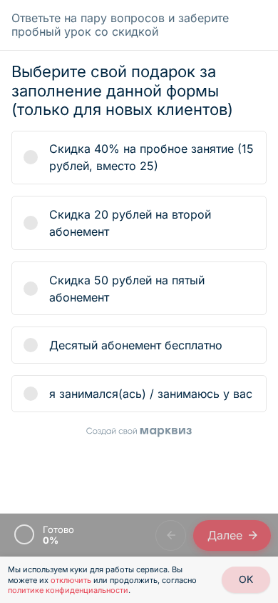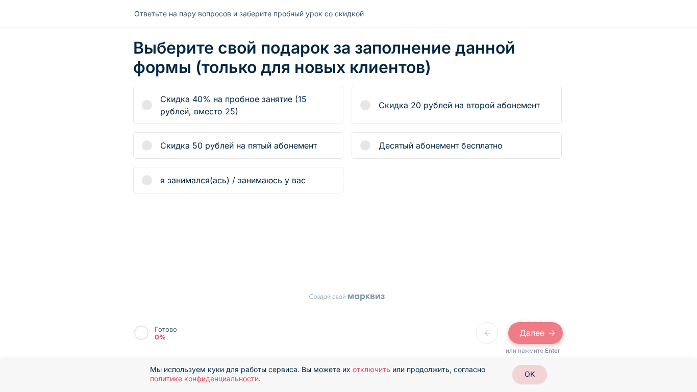 | SEO-лексика | скидка рублей абонемент ответьте пару вопросов заберите пробный урок скидкой выберите свой подарок заполнение данной формы только новых клиентов пробное |
