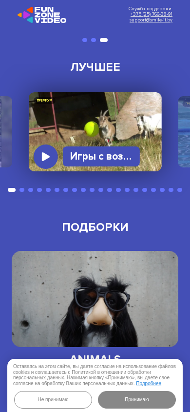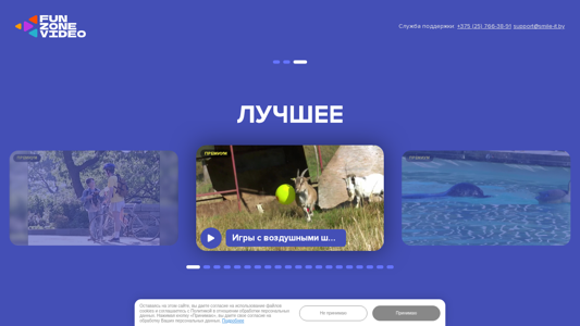 Веб-сайт Funzone video представляет собой платформу развлечений, предлагающую различные премиум-контент, включая игры с пузырьками воздуха и видео. Пользователи соглашаются на использование файлов cookie и политику обработки персональных данных, нажимая на кнопку 'Принимаю'. Веб-сайт предлагает подписки премиум за 4.6 рублей в неделю с автоматическим продлением. Для отмены подписки пользователи могут отправить SMS с текстом 'STOP1' по номеру 9697. Компания, предоставляющая услугу, — ООО "Смайл АйТи", расположенная в Минске, Беларусь.
