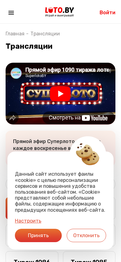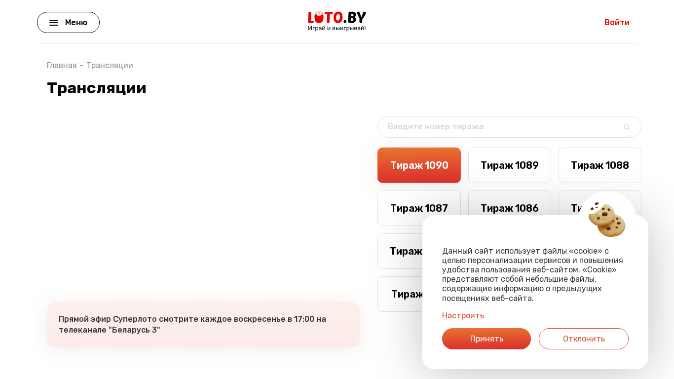 | AI-анализ | Описание: прямые трансляции. Слова, наиболее часто встречающиеся: "трансляции", "победители", "лотереи", "суперлото", "билеты", "каждое", "воскресенье", "телеканале", "Беларусь", "3", "17", "часа", "поддержка", "информация", "интересует", "проверка", "билетов", "прямой", "эфир", "о компании", "сайт". |