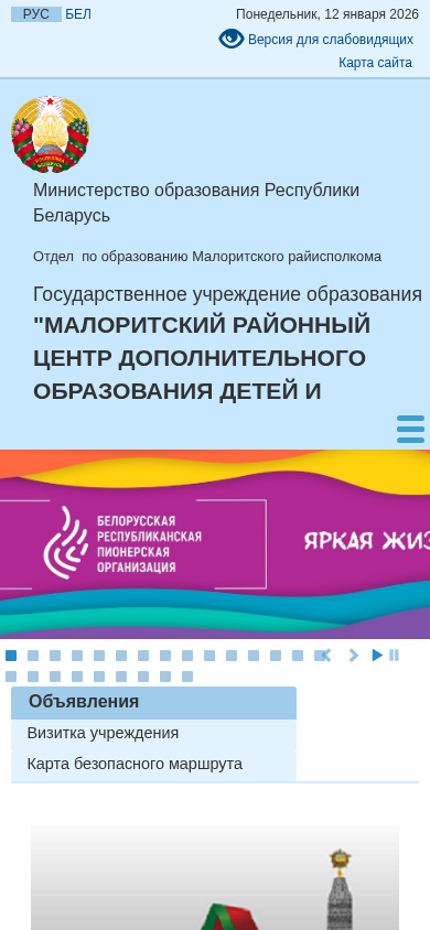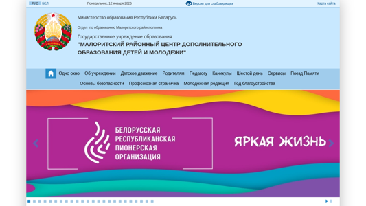 Этот сайт является официальной страницей для Малоритского районного центра дополнительного образования детей и молодёжи в Беларуси. Название сайта звучит как "Малоритский районный центр дополнительного образования детей и молодёжи" (Maloritsky Raionnyy Tsentr Dopolnitel'nogo Obrazovaniya Detey i Molodezhi). Раздел с описанием содержит никакую конкретную информацию. В разделе ключевых слов представлены слова, связанные с названием организации, расписанием, образованием, молодёжью и годом 2026. Сайт использует стандартный цветовой шематизм и изображения. Он предоставляет информацию о руководстве организации, расписании работы, административных процедурах и контактной информации. Кроме того, на сайте представлены разделы по истории организации, различным проектам, педагогическому составу и услугам. Сайт также включает календарь событий и архив новостей.