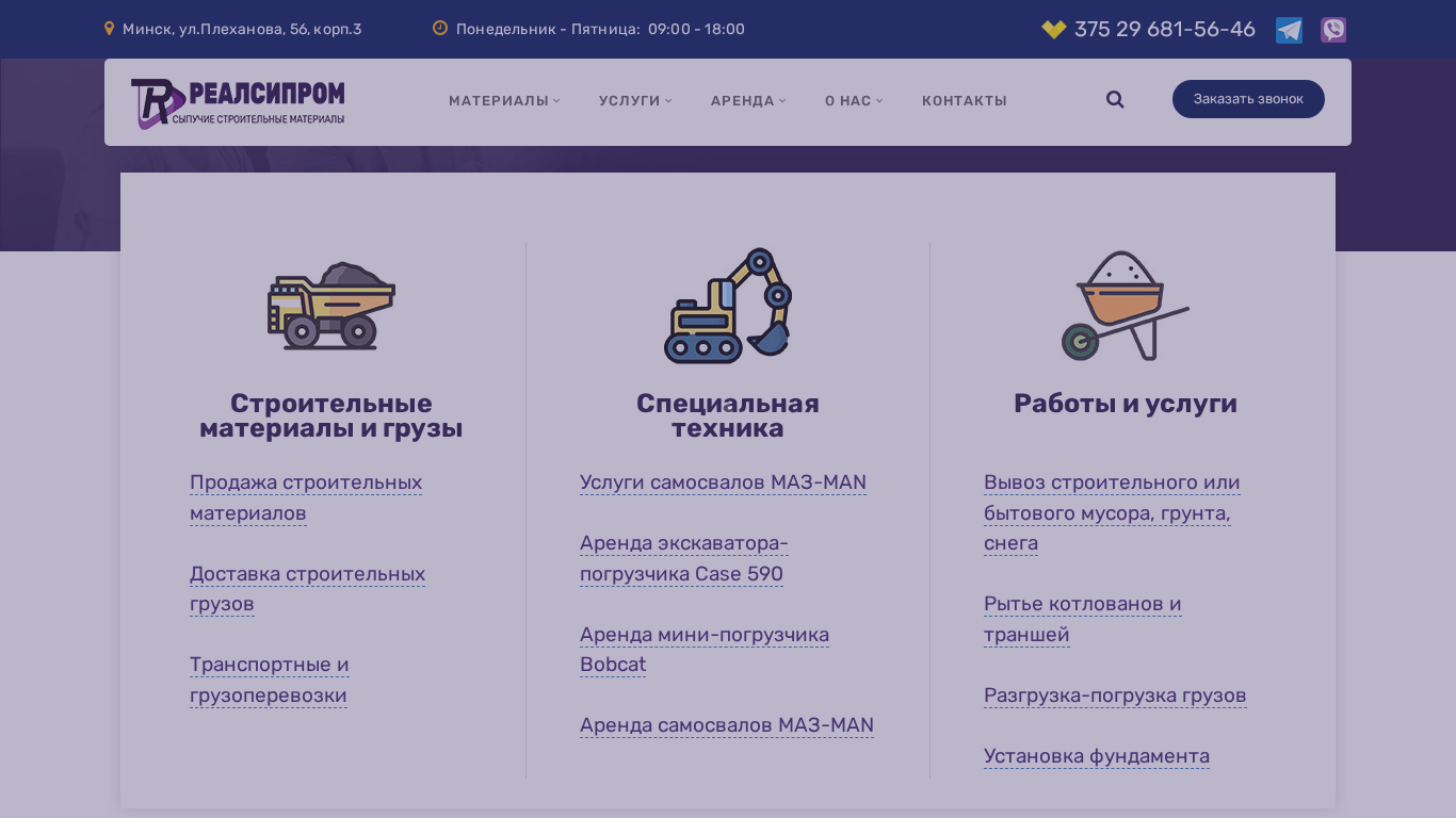 Название / ЗаголовокРеалсиПром – продажа и доставка песка, гравия, щебня – Оптовая и розничная продажа песка, щебня, гравия. Доставка специальным автотранспортом. Работаем с 2010 года.