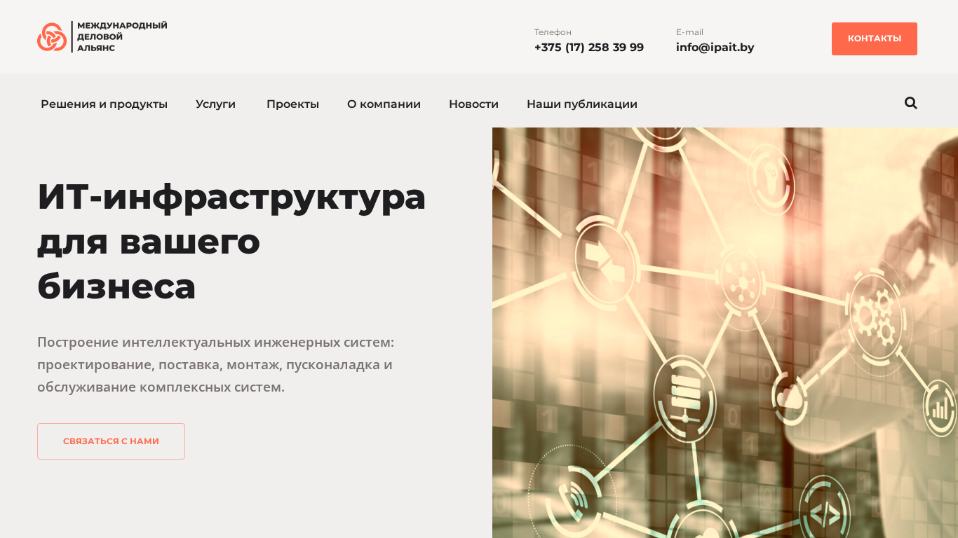 Портал Ipait.by является центром разработки для систем и решений в области информационных технологий. Они предлагают услуги по созданию индивидуальных решений для информационных систем, облачных решений, разработке и реализации автоматизации и роботизации бизнес-процессов, а также разработке мобильных приложений, включая создание и интеграцию продуктов и решений для инженерной инфраструктуры. Основные услуги включают в себя решения по аудио-видео технологиям, систем управления процессами, системы безопасности, оборудование и программное обеспечение, проектный дизайн, строительство и монтаж, разработку программного обеспечения, техническую поддержку, информационную безопасность и управление проектами. Компания специализируется на создании интеллектуальных систем инженерии, включая системы видеоконференций, системы безопасности, проекты по строительству и монтажу, автоматизированные системы управления процессами, проектирование проектов и предоставляет контактную информацию для обращений. На сайте упоминаются несколько успешных проектов, включая организацию центров управления сетями для БелТелеком, пилотный проект по управлению системой сушки жидкого покрытия, проект "умный дом" в Алматы и контроль оборудования для медиа-систем.