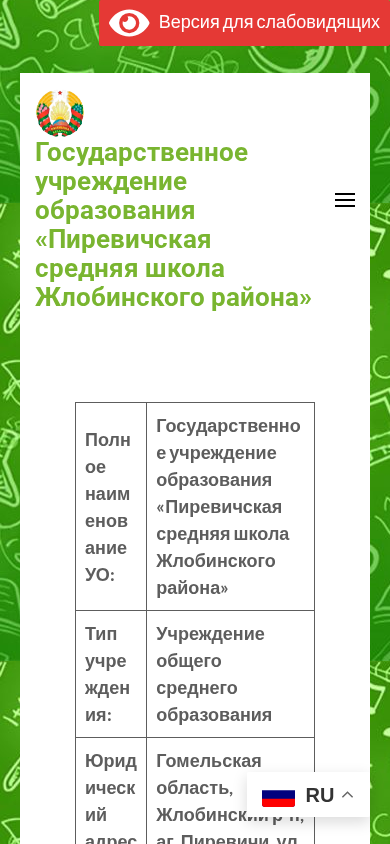 | Адрес | Учреждение общего среднего образования, Юридический адрес:, Гомельская область, Жлобинский р-н, аг. Пиревичи, ул. Школьная, д. 4 |