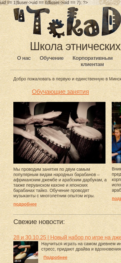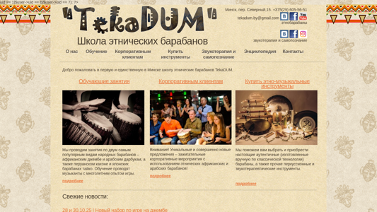 | AI-анализ | The portal is a school for ethnic drums 'TekaDUM' located in Minsk, Northern Per., 15. It offers drum training for two popular traditional types of drums - African djembe and Arabic darbuka, as well as Peruvian caione and Japanese taiko drums. Instruction is provided by experienced musicians. The site includes information on classes, corporate events, purchasing ethnic musical instruments, and news. The school also offers drums for sale, including authentic handmade ones, and various other percussion and sound therapy instruments. Upcoming events include a new djembe learning set on October 28 and 30, 2025. The school also hosts a Summer Night of Gongs event. |