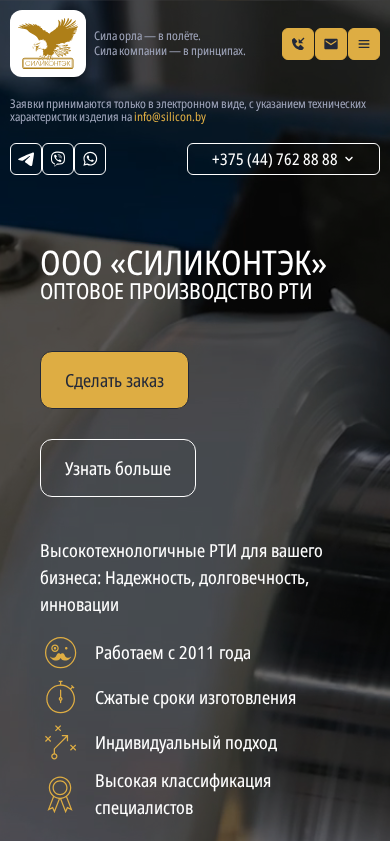 | AI-анализ | Этот онлайн-ресурс является веб-сайтом компании SiliconTek, специализирующейся на производстве и продаже технических изделий из силиконовой резины и промышленных уплотнительов по индивидуальному заказу. Компания работает с 2011 года и предлагает изготовление на заказ силиконовых технических изделий и промышленных уплотнителей. Для подачи заявок клиенты обязаны предоставлять информацию в электронном формате, включая технические характеристики желаемого изделия, на адрес info@silicon.by. Сайт содержит информацию о компании, её продукции и контактные данные, включая телефонные номера и электронные адреса, для подачи заявок и оформления заказов. Компания предлагает широкий ассортимент силиконовых изделий, включая трубы, профили, шунты, силиконовые листы, пневматические и специально разработанные уплотнители, бронированные силиконовые шлангахи и различные виды фитингов и клапанов. На сайте также представлена галерея продукции компании. |