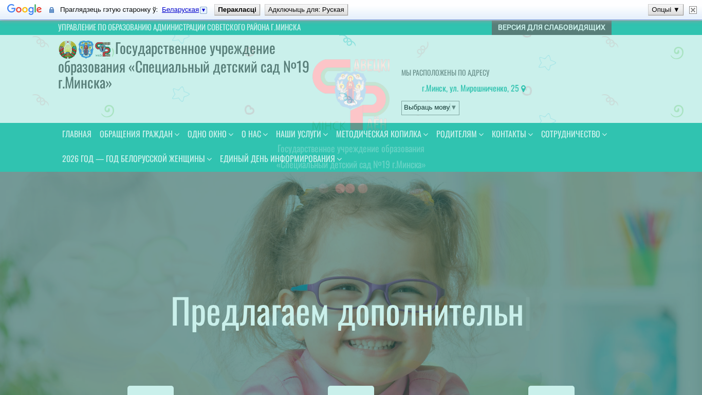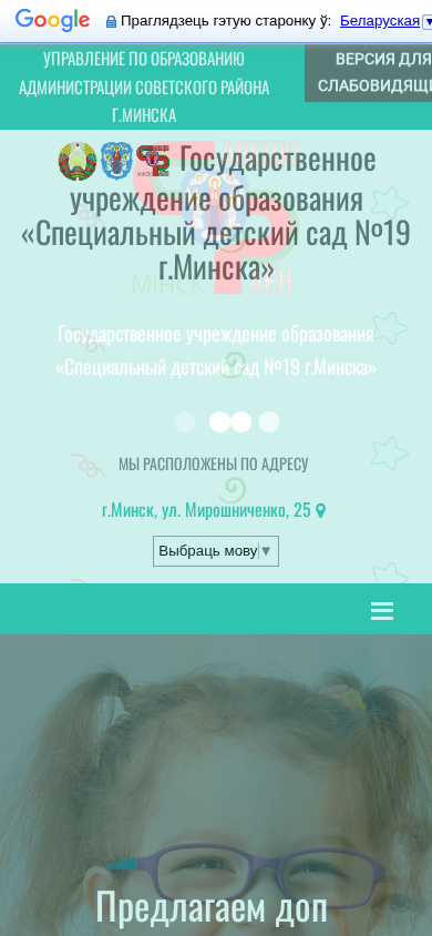 АдресУправление по образованию Советского района г. Минска, ГУО «Специальный детский сад №19 г. Минска», г. Минск, ул. Мирошниченко, 25