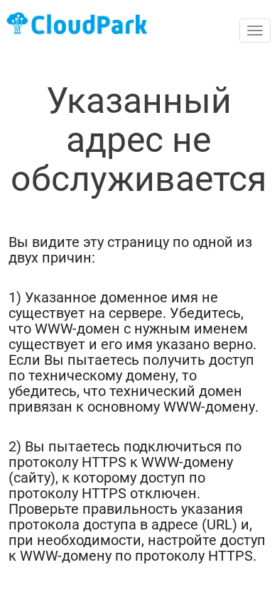 | Название / Заголовок | Указанный адрес не обслуживается - cloudpark.by |