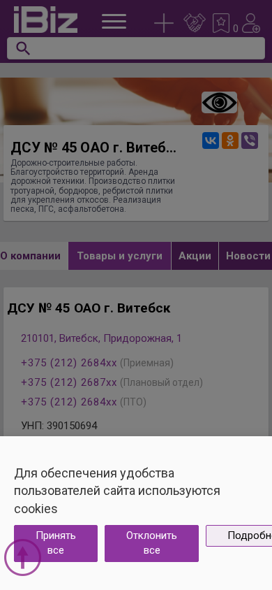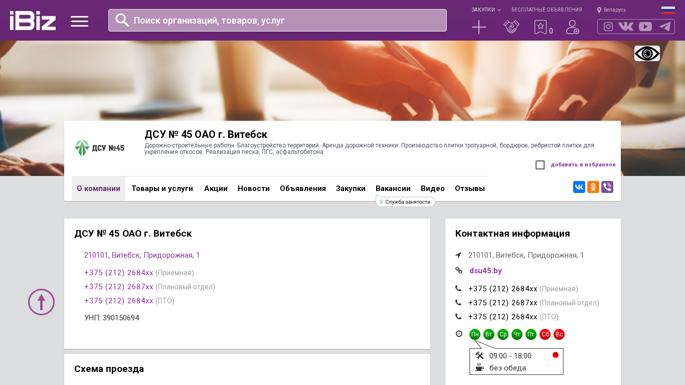 | Название / Заголовок | ДСУ № 45 ОАО г. Витебск - Дорожно-строительные работы. Благоустройство территорий. Аренда дорожной техники. Производство плитки тротуарной, бордюров, ребристой плитки для укрепления откосов. Реализация песка, ПГС, асфальтобетона.. 210101, Витебск, , Придорожная, 1 |