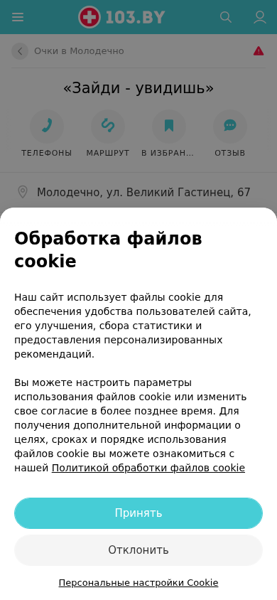 Этот сайт предоставляет информацию о конкретном месте в Молодечно, Беларусь - "Зайди - увидишь Молодечно ул. Великий Гастинец 67". Сайт предлагает детали, такие как телефонные номера, графики работы и отзывы клиентов для этого адреса. Заголовок предполагает, что сайт является частью медицинского портала "103.by". Сайт включает в себя функцию поиска, возможность сохранения элементов, функцию входа и способность сообщать о сбоях. Пользователи могут оставлять отзывы за адрес и смотреть количество раз, когда он был просмотрен. Отзывы касаются проблем с качеством очков и отсутствия последовательности со стороны директора по выполнению обещаний. Сайт также включает в себя карту, показывающую расположение адреса. На этом сайте часто упоминаются слова "зайди", "увидишь", "молодечно", "отзывы".