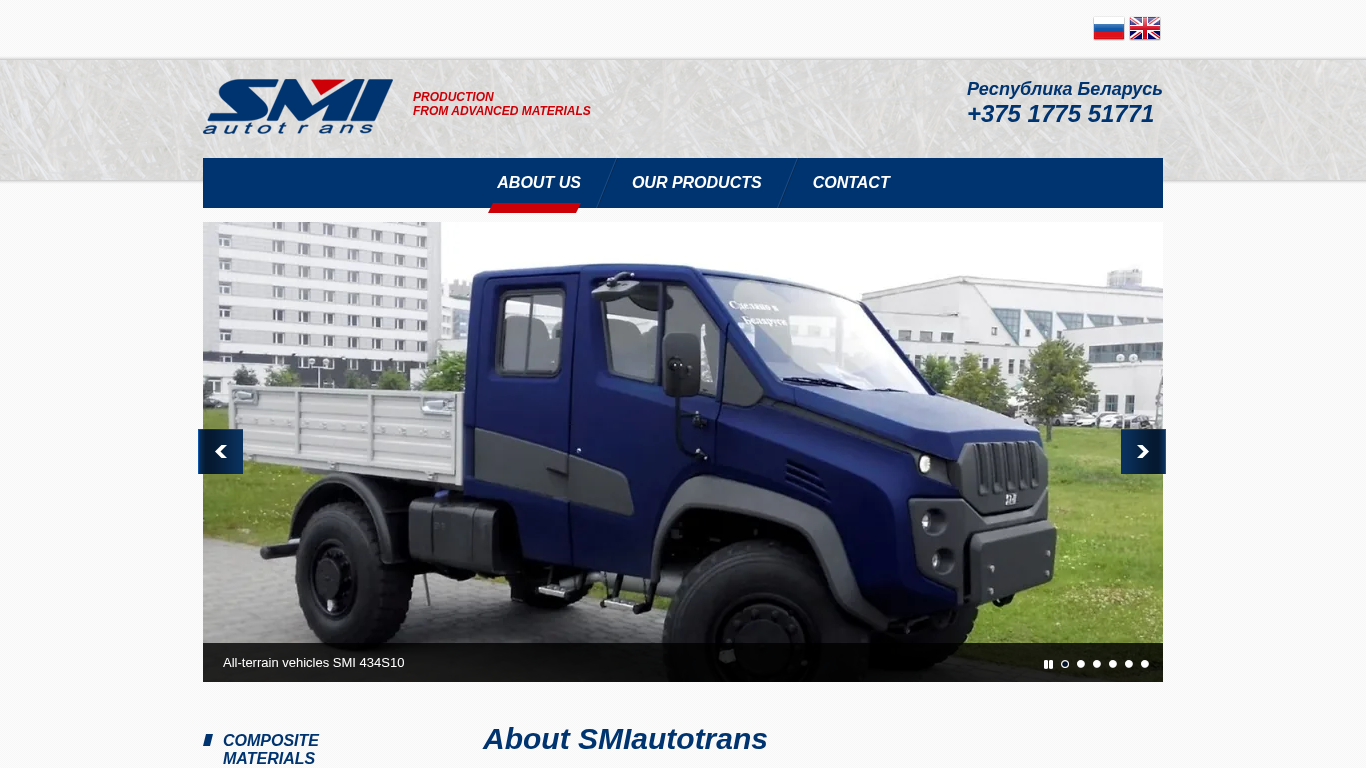 | AI-анализ | Этот сайт предназначен для ООО "СМИавторанс" (SMIautotrans, LLC), белорусская компания, специализирующаяся на производстве композитных материалов для различных отраслей, включая механическую инженерию, водный транспорт и инструментальную инженерию. Основанная в 1998 году, компания инвестирует в исследования и разработку новых композитных материалов и технологий. Они производят широкий спектр продуктов, от прототипа до серийного выпуска, и имеют собственные возможности по дизайну и инженерии для обеспечения качества продукции. Сайт предоставляет информацию о компании и ее предложениях, а также контактную информацию. |