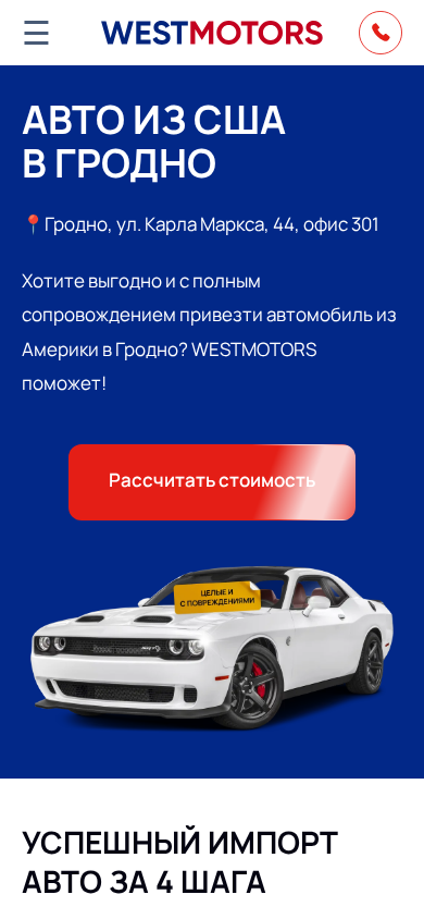 | SEO-описание | Хотите выгодно купить авто из США в Гродно? Звоните в Вестмоторс! ☎ +375(29)170-70-01 ✅ Помощь в растаможке ✅ Открытые цены |