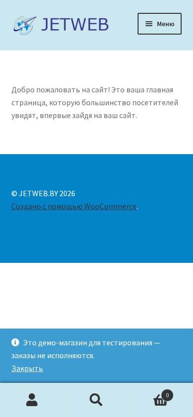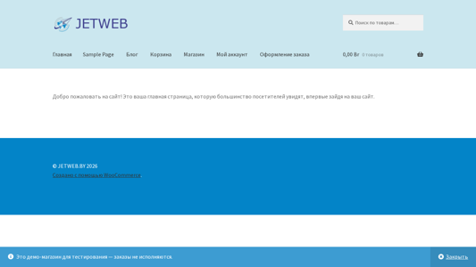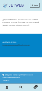 Портал JETWEB.BY представляет собой демонстрационное приложение для тестирования, где заказы не обрабатываются. Он включает в себя главную страницу, блог, корзину покупок, магазин, страницу моего аккаунта и форму заказа. Сайт построен на WooCommerce и на данный момент пуст, без заказов или товаров в корзине.
