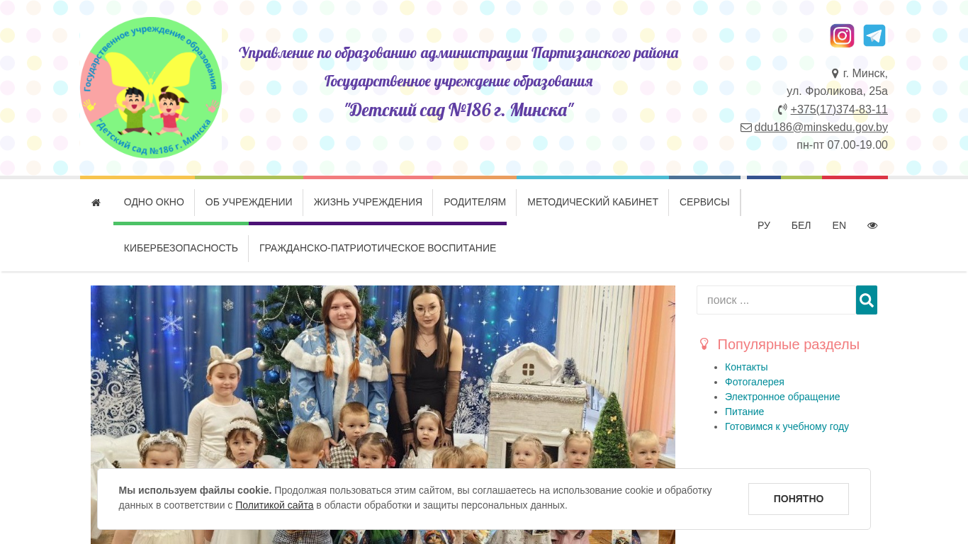 | AI-анализ | Проект веб-сайта "Детский сад №186 г.Минска" (Дошкольная школа №186 в Минске) использует куки и соглашается на их использование и обработку данных в соответствии с Политикой конфиденциальности сайта для обработки и защиты персональных данных. Учреждение является частью Администрации образования Партизанского района в Минске, расположенное по адресу ул. Фроликова, 25а. Оно работает с понедельника по пятницу, с 07:00 до 19:00. Сайт предоставляет информацию о процедурах управления, нормативных правовых актах, контактах, задачах и функциях, условиях приема, персонале, правилах работы педагогических работников, лицензировании, вакансиях на работу, графике рабочего времени, политиках обработки и использования куки, видеонаблюдении, жизни учреждения, включая образование для всех, платных услугах, галерее фотографий, профсоюзе, подготовке к новому учебному году, гуманитарным проектам, уголке родителей. |