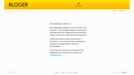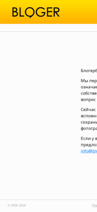 | AI-анализ | Портал представляет собой платформу для личных блогов, предназначенную для пользователей домена .BY из Беларуси. Сайт позволяет пользователям создавать, получать доступ и управлять своими личными блогами, а также предоставляет функцию поиска и вход в сообщество блогеров. Интерфейс платформы на данный момент переходит к формату личного блога, что означает, что пользователи будут видеть только свои собственные публикации. Пользователи могут войти для доступа к своему блогу и просмотра своих прошлых постов и фотографий. Сайт также включает раздел с помощью и контактную электронную почту для обращений или отзывов. Домен является частью более широкой платформы blogger.by, с конкретным поддоменом loyiver.bloger.by. |