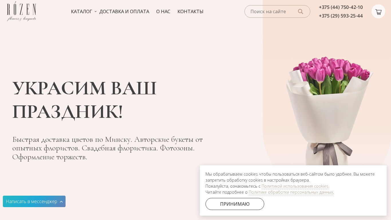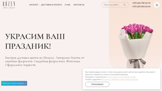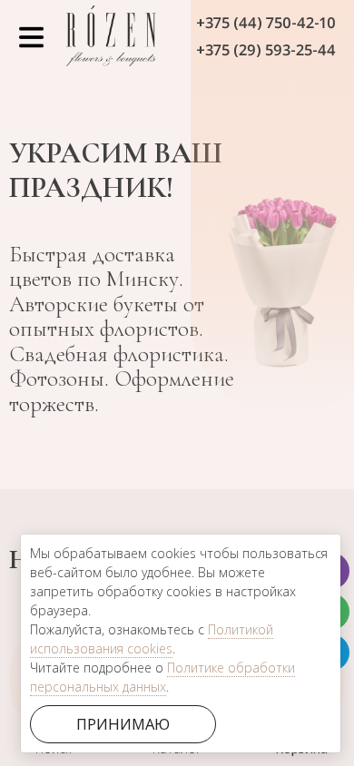 | SEO-описание | Главная. Быстрая доставка цветов по Минску. Авторские букеты от опытных флористов. Свадебная флористика. Фотозоны. Оформление торжеств. Звоните сейчас +375 (44) 750-42-10 |