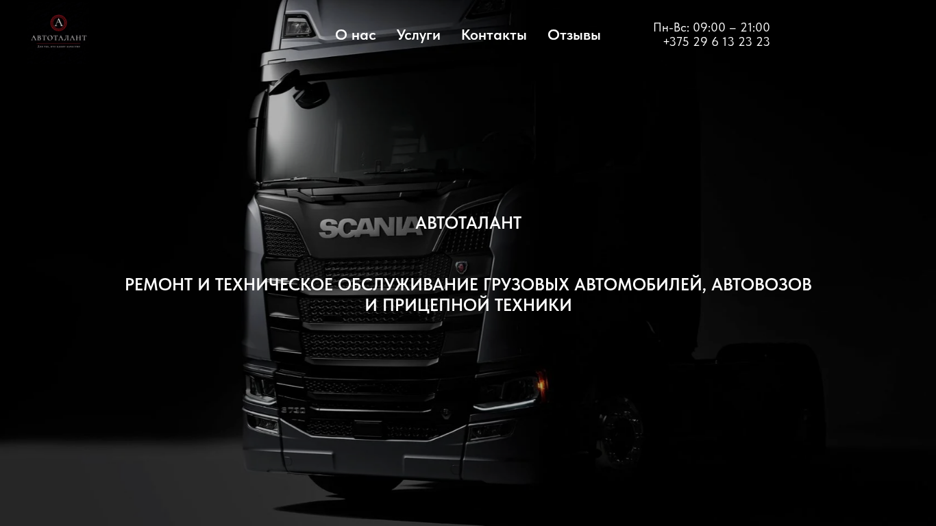 | SEO-описание | Ремонт и обслуживание грузовых автомобилей в Минске, ремонт автовозов и прицепной техники. Диагностика. Схождение. Заправка автокондиционеров.Гарантия на все виды работ. Опытные мастера. Современное оборудование. Продажа запасных частей из Европы. |