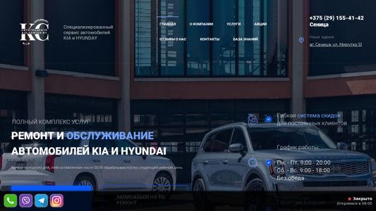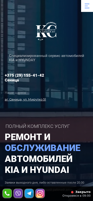 | SEO-описание | Сервис центр KiaCenter ремонт, постгарантийное обслуживание, диагностика Kia и Hyundai, в Минске полный спектр ремонтных работ ☎️ +375 (29) 155-41-42 |