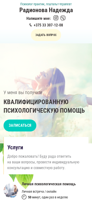 | SEO-описание | Радионова Надежда - психолог практик / гештальт-терапевт. Помощь частного психолога в Минске. Индивидуальная психологическая консультация онлайн, семье, для женщин и мужчин, груповая терапия. Усулги оптытного гештальт терапевта. Обратиться или записаться по тел.: +375 33 307-12-08 |