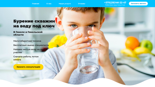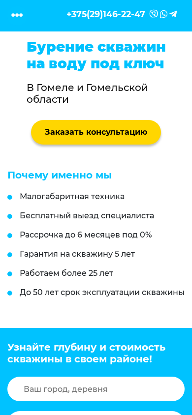 | AI-анализ | Сайт предназначен для компании по бурению скважин, базирующейся в Беларуси, с акцентом на регионы Гомель и Гомельская область. Компания предлагает услуги, связанные с бурением скважин по заказу, используя малогабаритное оборудование. Они гарантируют наличие чистой воды на любом объекте и предлагают бесплатную консультацию. В их услуги входят бурение скважин, определение местоположения водозаборной скважины и установка систем водопровода разного диаметра. Также они предлагают 5-летнюю гарантию на свои скважины и возможность финансирования через 6-месячный кредит без процентов. На сайте указан контактный номер, пользователи могут запросить консультацию или сделать звонок для организации визита. Компания имеет положительные отзывы клиентов, подчеркивающие их профессионализм, скорость и качество работы, а также ответственность. |