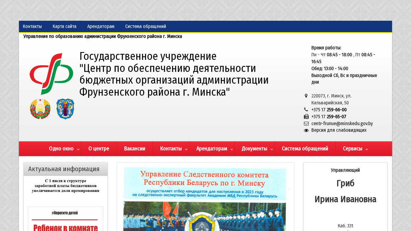 | AI-анализ | Портал centr-frunue.minsk.edu.by является государственным ресурсом для Центра Поддержки Бюджетных Организаций в районе Фруунзено, Минск, Беларусь. Сайт предлагает информацию о предоставляемых центром услугах, контактной информации и необходимых документах для аренды помещений под различные мероприятия и найма персонала. Ключевые слова, ассоциируемые с сайтом, включают 'район Фруунзено', 'администрация', 'комитет образования' и 'аренда'. Сайт содержит разделы для контактов, карту сайта, вакансии и комиссию против коррупции. Время работы указано как понедельник по четверг с 8:45 до 18:00, пятница с 8:45 до 17:45, с обеденным перерывом с 13:00 до 14:00. Сайт также включает раздел... |