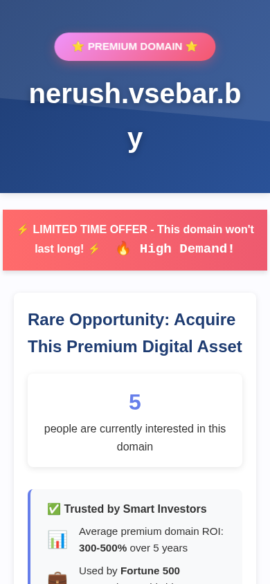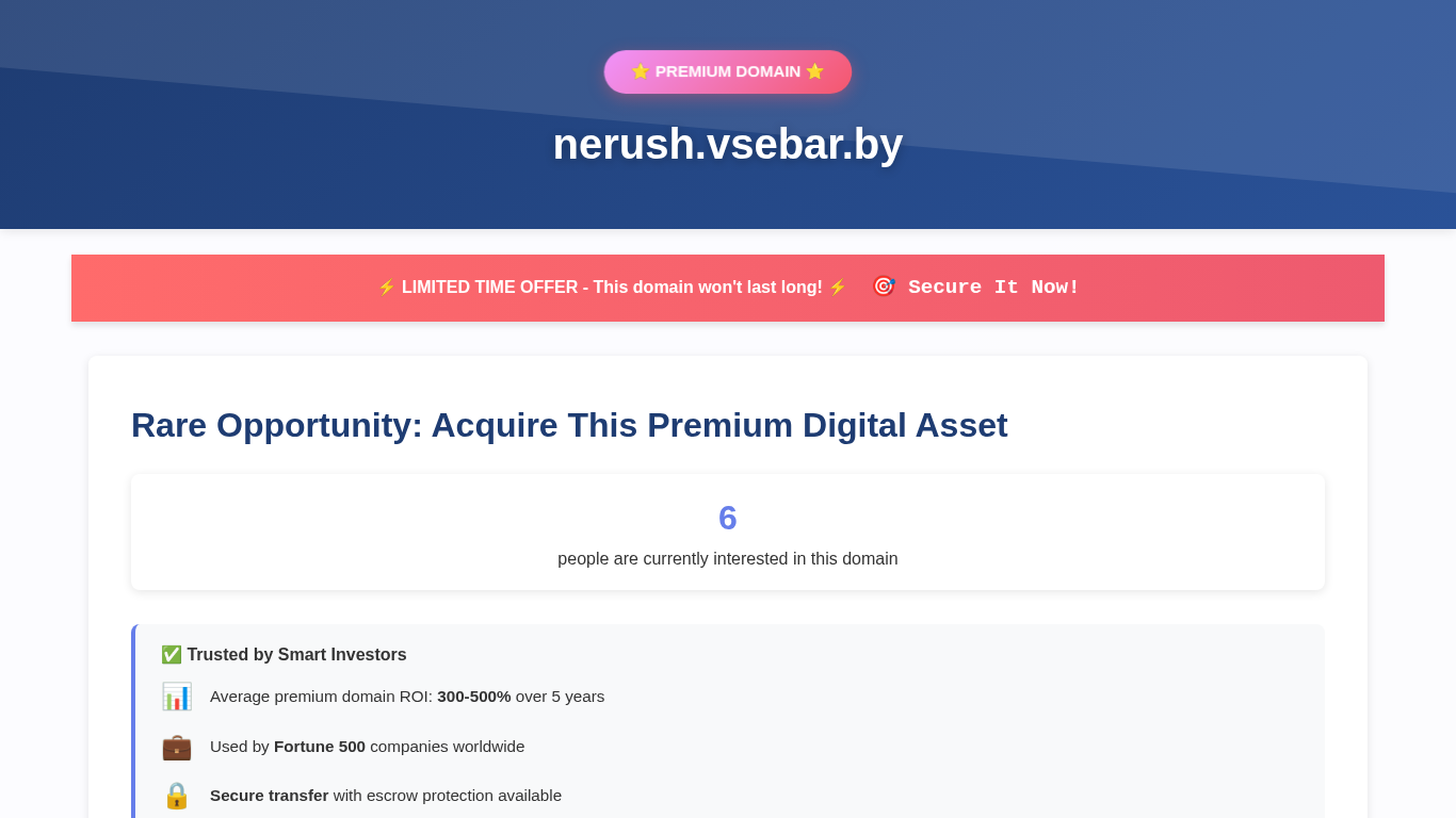 Портал предлагает премиальный домен nerush.vsebar.by для приобретения. Этот домен на данный момент вызывает интерес у шести индивидуумов, делая его привлекательным активом для потенциальных инвесторов. Портал утверждает, что премиальные домены имеют средний ROI в диапазоне от 300 до 500% за пять лет и используются всемирно известными компаниями Fortune 500. Для домена доступна безопасная передача с защитой эскроу. Портал приглашает серьезные предложения, приоритетное рассмотрение которых предоставляется для конкурентоспособных предложений. Значимость домена заключается в его потенциале для верификации безопасности, маркетинговой мощности, преимуществе SEO, мгновенной доверенности, глобальной узнаваемости и конкурентном барьере. Процесс передачи 100% безопасен, с профессиональной услугой эскроу и поддержкой.