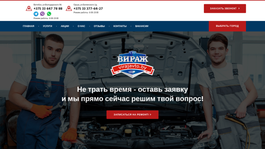 | AI-анализ | Проект "Вира" на вебе является долгосрочным бизнесом в автомобильной отрасли, предлагающим широкий спектр услуг по ремонту, покраске, замене масла и мойке. Предприятие располагается в Минске, Орше и Могилевской области. В Минске офис находится по адресу ул. Володарского 96, телефон +375 (33) 647-78-88, работает с 8:00 до 20:00. Офисы в Орше расположены по адресам ул. Белинского 3д (телефон +375 (33) 377-64-27) и ул. Пушкинская 10 (телефон +375 (29) 812-14-44), оба работают с 8:00 до 20:00. |