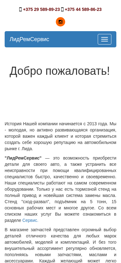 | AI-анализ | Портал "Добро пожаловать! - ЛидРемСервис" является белорусским веб-сайтом по ремонту автомобилей и продаже запчастей. Он предлагает диагностические и ремонтные услуги для различных компонентов, включая подвеску, систему питания топливом, кондиционирование воздуха и системы рулевого управления. Сайт также предоставляет услуги по монтажу шин и компьютеризированные диагностики. Пользователи могут обращаться в компанию по телефонам +375 29 589-89-23 и +375 44 589-86-23 для получения информации или для бронирования встреч. На сайте присутствует панель навигации с ссылками на основные разделы: Главная, Услуги, Контакты и Грузовые услуги. Компания была основана в 2013 году и гордится тем, что предлагает быстрые, качественные и своевременные ремонты с использованием современного оборудования, включая полнооборотный подъемник для привода и последние масла. |