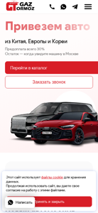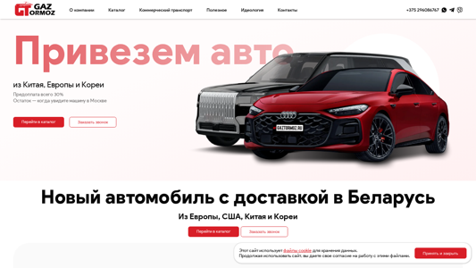 | AI-анализ | Этот онлайн-ресурс называется GazTormoz, веб-сайт, специализирующийся на продаже новых автомобилей с доставкой. Покупатели могут заказывать транспортные средства по конкурентоспособным ценам и получать индивидуальный выбор автомобилей. Компания доставляет машины в любую регион. Сайт содержит каталог автомобилей с актуальными ценами. Дополнительную информацию можно найти на сайте или звонив по телефону +375 296086767. Компания импортирует автомобили из Европы, Китая и Кореи. Для покупки требуется предоплата в размере 30%, остальная сумма должна быть выплачена при получении транспортного средства в Москве. Сайт включает каталог, возможность запросить звонок и информацию о транспортных средствах, импортированных из Европы, Китая и Кореи. В ассортименте представлены бренды BMW, Audi, Volkswagen, Porsche, Ford, Mercedes-Benz, Ferrari, Volvo, Lamborghini, Nissan, Jeep, Citroen, Lexus. |